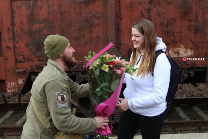 Військовий на ім’я Володимир та його кохана Вікторія мали зустрітися на пасажирській платформі на вокзалі Краматорська, — і вони зустрілися, проте чоловік зробив для своєї дівчини сюрприз, прийшов із квітами, обручкою та запропонував вийти за нього заміж.