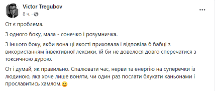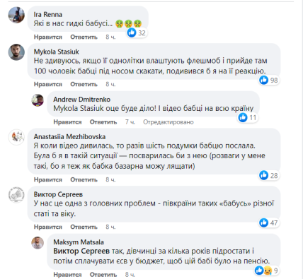 Відеозапис суперечки на своїй сторінці у соцмережі оприлюднив співзасновник "Демократичної сокири", блогер, публіцист Віктор Трегубов, зазначивши, що в такій ситуації ще варто задуматися, чи правильно вчинила дівчинка, адже спалювати нерви на таких "токсичних" людей — точно зайве.