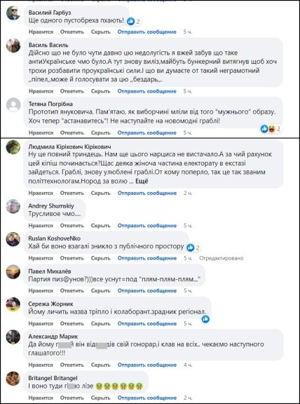 "Нехай іде слідом за кораблем", "Нам ще цього нарциса не вистачало. А за чий рахунок цей кіпіш почнеться?", "Прототип Януковича. Пам’ятаю, як виборчині мліли від того "мужнього" образу. Хоч тепер "астанавітєсь!". Не наступайте на новомодні граблі", "Це непорозуміння має сидіти у в’язниці, а не розробляти політичну програму", — серед іншого, пишуть у коментарях.