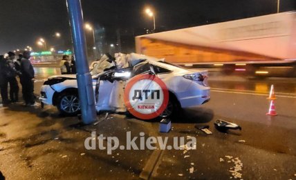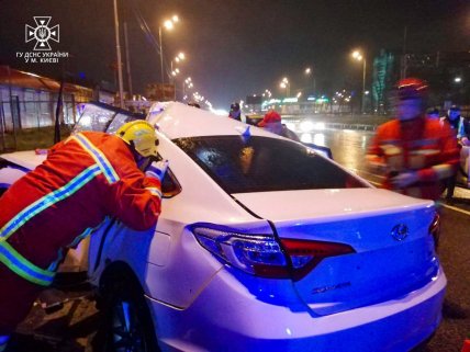 Окрім вибуху гранати на Троєщині в Києві ввечері 15 квітня сталася ще одна неординарна події — у Святошинському районі водій за кермом Hyundai Sonata на швидкості влетів у стовп. Чоловіка довелося вирізати рятувальникам з понівеченої автівки.