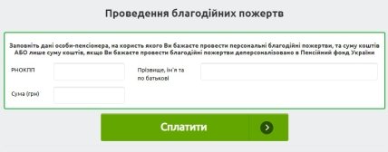 - далі потрібно заповнити необхідні поля (внесок можна зробити для певного пенсіонера або ж на користь усіх пенсіонерів. Залежно від вибору змінюватиметься та інформація, яку потрібно надати);