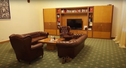 З зали чиновник веде журналіста до так званої "кімнати відпочинку", де начебто панує "творчий безлад" з картинно залишеними біля крісла чоботами.