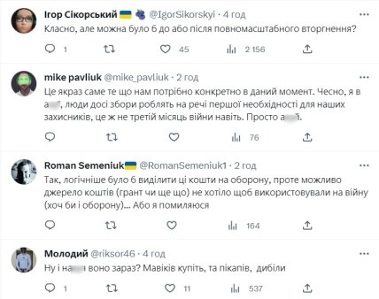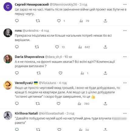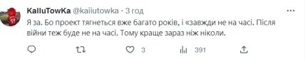 А хтось нагадав, що культура — це частина майбутнього, за яке зараз йде війна: "Якщо не вкладати гроші в культуру та науку, за що ми тоді воюємо. Думка не нова". Однак знайшовся і коментар, який повністю підтримав таке рішення влади навіть під час війни: "Я за. Тому що проект тягнеться вже багато років, і "завжди не на часі". Після війни теж буде не на часі. Тому краще зараз, ніж ніколи ".
