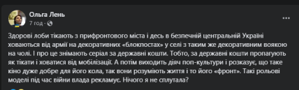 "Здорові лоби тікають з прифронтового міста і десь в безпечній центральній Україні ховаються від армії на декоративних "блокпостах" у селі з таким же декоративним воякою на чолі. І про це знімають серіал за державні кошти. Тобто, за державні кошти пропагують як тікати і ховатися від мобілізації", — заявила Лень.