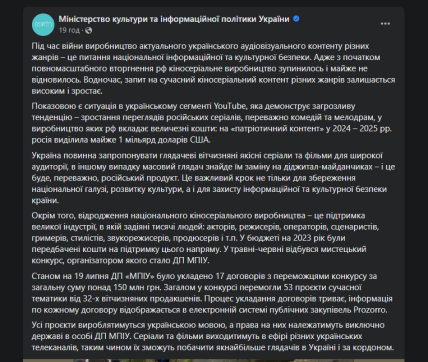"Під час війни виробництво актуального українського аудіовізуального контенту різних жанрів — це питання національної інформаційної та культурної безпеки. Адже з початком повномасштабного вторгнення рф кіносеріальне виробництво зупинилось і майже не відновилось. Водночас, запит на сучасний кіносеріальний контент різних жанрів залишається високим і зростає", — заявили в Мінкульті.