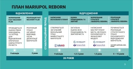 Швидке відновлення Маріуполя — про безпекову складову, освіту, медицину, комунальні послуги. Це ми пропрацювали з допомогою британських експертів. Почали у вересні минулого року, паралельно із розробкою дизайну міста — зібрали 12 команд, які для етапу відновлення нагенерували 154 проєкти на 28,5 млрд гривень. Зараз ми знаємо, що робити покроково, які фахівці і техніка потрібні, що швидке відновлення зажадає приблизно два роки. На стабілізацію ситуації в цілому піде приблизно п'ять років. Деякі процеси можуть бути паралельними.