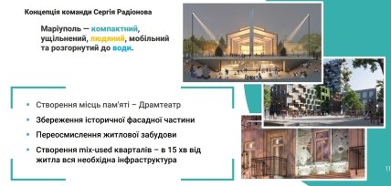 Ми знову звернулись до маріупольців із запитанням: "Яким ви бачите місто?" Це було для всіх болюче питання, як і для мене, коли я почув його вперше: ви бачите його містом таким, як воно було, чи новим. І люди сказали, що однозначно треба будувати нове місто, але зберегти історію. Далі були запитання — що залишити, що прибрати?