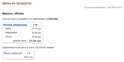 Нині середня ціна на яблука в Україні, за даними порталу "Мінфін", становить 37,00 грн за кілограм. Важливо враховувати, що їхня вартість відрізняється залежно від магазину. Найдешевші яблука в Metro – станом на 12 серпня кілограм коштує 31,10 грн. У Novus їх можна придбати за 34,99 грн/кг. Найдорожче доведеться заплатити за них у Megamarket – аж 44,90 за кілограм.