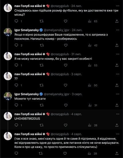 Історія почалася з повідомлення користувача "Голуб на війні" в Twitter, в якій він дорікнув Укрпошті та Смілянського в тому, що йому не прийшла посилка із замовленою футболкою.