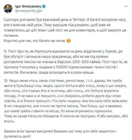 Після скандалу сам Смілянський видав повідомлення, в якому зазначив, що засвоїв урок.