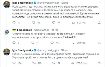 На цю скаргу зреагував сам Смілянський, який після недовгих розглядів заявив, що посилка нібито була оформлена за найдешевшим тарифом, а тому може бути розцінена як конверт з маркою. Тобто відстежити її неможливо.