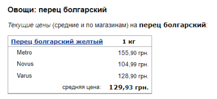 Болгарський перець у період з липня до серпня подешевшав на 16 гривень. Місяцем раніше його продавали у середньому за ціною 146,04. Нині його вартість у супермаркетах становить 129,03 гривні. До речі, цього року найвищу ціну на перець було зафіксовано у квітні. Тоді кілограм овочів коштує 238,84 грн за один кілограм.