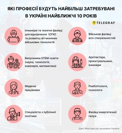 Крім того, заступниця міністра зазначила, що в Україні будуть потрібні медичні працівники, включно з реабілітологами та психологами. Також будуть затребувані фахівці енергетичної галузі, фахівці з публічної політики та фахівці будівельної галузі, зокрема архітектори, проєктувальники, інженери.