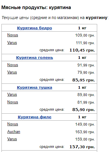 Так, у період із листопада по грудень значно впали ціни на курятину. Наприклад, філе подешевшало зі 160,48 гривні за кілограм до 157,30. Куряче стегно змінилося у вартості зі 114,02 до 110,45.