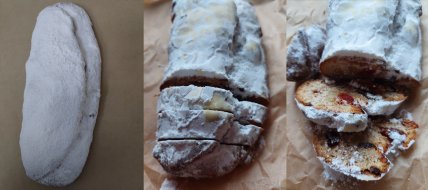 — Рецептів цієї випічки дуже багато. Найбільше часу треба на те, щоб настояти сухофрукти на коньяку. Беру, до речі, не найдорожчий, це не принципово. Хтось використовує ром. Алкоголь у даному разі виступає ароматизатором і консерватором, завдяки чому випічка зберігається тривалий час. Досить, щоб сухофрукти (родзинки, в’ялена журавлина і вишня, подрібнені сухі груші, курага) помокли три-чотири доби. Особливістю моїх цьогорічних штоленів є апельсинові шкірки, відварені в апельсиновому соку й "законсервовані" коньяком. Вони стояли рівно рік, чекаючи свого часу. Це і є начинка для тіста.