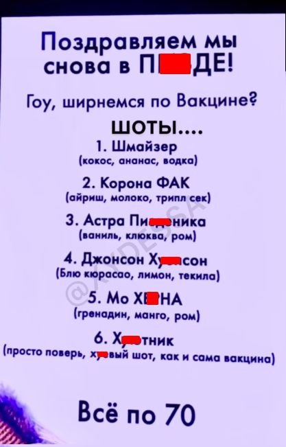 В меню відвідувачам пропонують "вакцинуватися" алкогольними коктейлями, назви яких співзвучні з назвами популярних вакцин від коронавірусу: Pfizer, Coronavac, AstraZeneca, Johnson & Johnson, Moderna і "Супутник V".