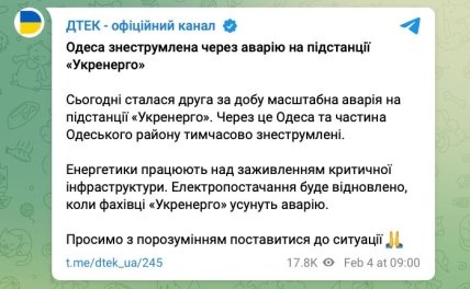 Водночас ДТЕК повідомляє про другу аварію і те, що знеструмлено Одесу та частину Одеського району.