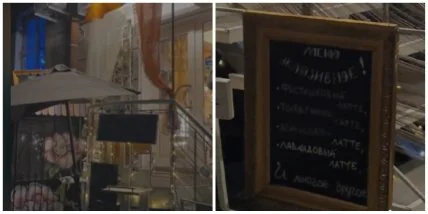 Варто зазначити, що на відео видно, що меню в кафе було повністю російською мовою, як і на штендері перед входом, де вказані ціни на кавові напої.