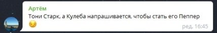 Більшість інших коментаторів також підняли Кулебу на сміх і розкритикували таку поведінку. Дехто навіть успішно пожартував про те, що ймовірним порятунком України від Росії міг би стати Тоні Старк, персонаж супергеройських фільмів про Залізну Людину.