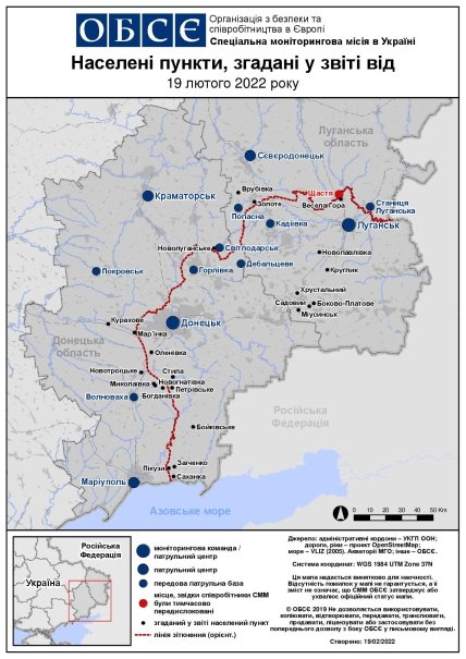 Нижче публікуємо картку СММ ОБСЄ щодо порушень припинення вогню на Донбасі за 19 лютого, на якій видно орієнтовні межі територій, які й нині перебувають під контролем російських формувань та кордони Донецької та Луганської областей.