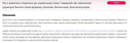 Згідно з наявними даними, переважна більшість заяв російського лідера озвучувалися із замовчуванням фактів, підміною понять, навішуванням ярликів, використанням фальшивих зв’язків, аналогій та трактувань, поєднання правди та брехні, а також відвертої брехні. Окрім того, факти які наводив у приклад Путін, не містять фактажу та є лише бездоказовою брехнею.
