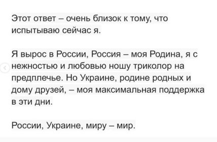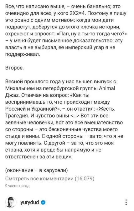 За словами Дудя, він підтримує Україну в ці дні: "Я виріс у Росії, Росія — моя батьківщина, я з ніжністю та любов’ю ношу триколор на передпліччі. Але Україні, батьківщині рідних та дому, друзів, — моя максимальна підтримка в ці дні".