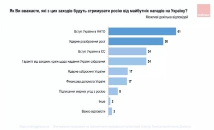 Тож, 61% опитаних українців вважають, що вступ України до НАТО стримає росію.