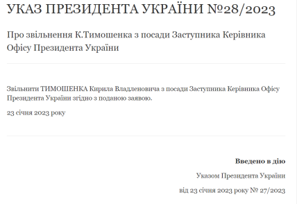 Тим часом, на сайті президента вже з'явився офіційний указ про звільнення Кирила Тимошенко. Він набув чинності з 23 січня 2023 року.