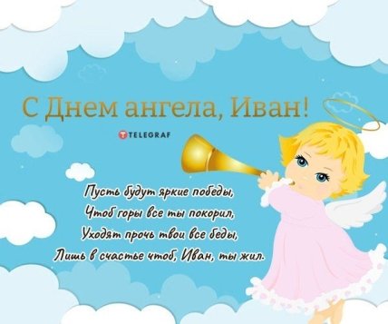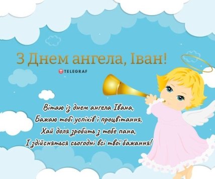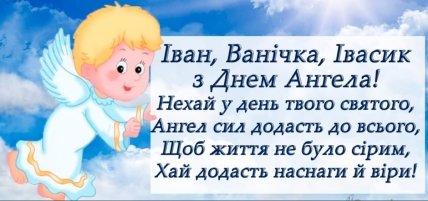 Вітаю тебе, Ваню, з днем Ангела і бажаю, щоб твій ангел завжди тебе оберігав і допомагав тобі в усіх твоїх справах – домашніх і робочих, щоб всі твої починання були втілені в життя, щоб тебе завжди супроводжували удача, процвітання та успіх.