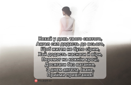 - Іванко, у День ангела бажаю душевної краси, терпіння, розуміння, виконання мрій, теплих обіймів рідних та близьких. А з ангелом своїм дружи всім чистим серцем і вір у диво з ним!