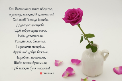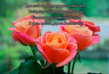 - У цей чудовий день хочу побажати тобі багато радості та здоров’я. Щоб у твоєму житті все складалося якнайкраще, бо ти, Валентино — саме та людина, яка заслуговує на все найкраще! Хай янгол-охоронець ніколи не злітає з твого плеча і завжди тебе боронить у страшні миті, а їх, своєю чергою, щоб було якомога менше. Миру, любові, добра та процвітання!