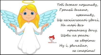 - Вітаю з іменинами! Нехай життя дарує тобі побільше яскравих моментів та посмішок і всі твої найсміливіші бажання збуваються! Бажаю, щоб твій ангел не покидав тебе, аби в твоєму домі завжди панували щастя, любов і взаєморозуміння. Нехай тебе оточують тільки щирі та надійні люди!