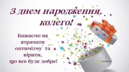 Колега дорогий, вітаю з днем народження. Нехай гроші самі лізуть у кишеню, нехай справи чарівним чином творяться і ведуть до успіху, нехай життя приносить море позитиву та щирого сміху, нехай любов 💖💕протягом багатьох років залишається пристрасним, а будь-яка авантюра цікавою та безпечною.