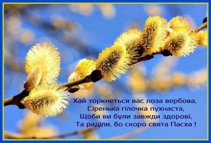 Від усієї душі вітаю тебе з Вербною Неділею, днем, коли Господь наш увійшов у Єрусалим! Нехай в цей день в твій дім ввійде щастя, здоров'я і світло! Нехай освячені верби бережуть твій дім від напастей, а тебе від хвороб!