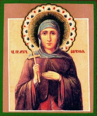 Євгенія Римська постраждала за віру в Ісуса Христа в 262 році, при імператорі Галіене. Спочатку її зрадили тортурам, потім усікли мечем.