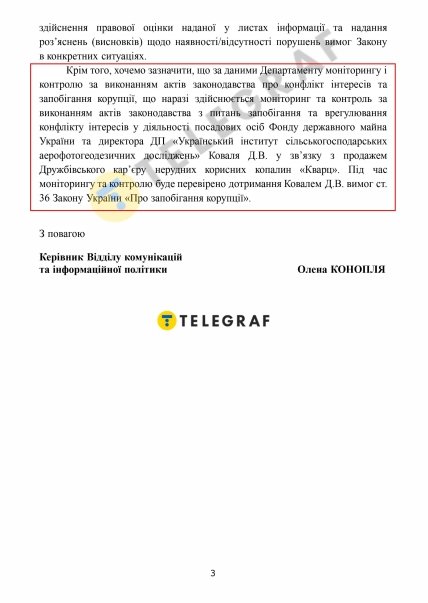 У той же час Департамент моніторингу та контролю НАЗК саме зараз проводить перевірку дій ФДМУ та Дмитра Коваля при продажі Дружбовського кар’єру на предмет можливої наявності конфлікту інтересів при даній угоді.