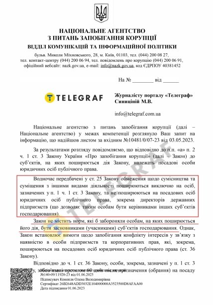 Як пояснили у своїй відповіді на запит "Телеграфа" у Національному агентстві запобігання корупції (НАЗК), пояснили, що директори держпідприємств, згідно зі статтею 25 Закону України "Про запобігання корупції", мають право бути керівниками інших суб’єктів господарювання.