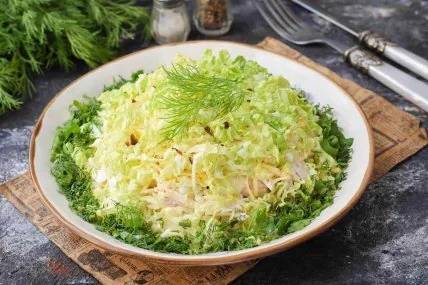 - По всій поверхні салату розподіляємо тертий сир. Зверху — терті яйця. Змащуємо соусом. Викладаємо пекінську капусту, а на неї — залишки соусу. За бажанням посередині салату викладаємо доріжку з томатів чері.