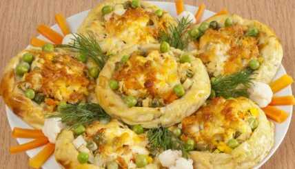 - Для начинки відварюємо філе, підсмажуємо до золотистого кольору на олії цибулю. М’ясо подрібнюємо блендером, додаємо цибулю, вершкове масло, солимо і перчимо до смаку.