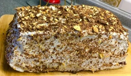 - Формуємо торт, змащуючи коржики, верх та боки кремом. Прикрашаємо тертим шоколадом, подрібненими горіхами.
