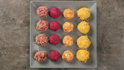 - Половину морквяних кульок обвалюємо в крихті жовтка, а половину бурякових – у натертому сирі.