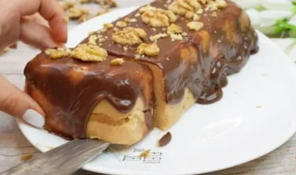 Дістаємо, поливаємо розтопленим шоколадом, прикрашаємо горішками. Подаємо з улюбленим напоєм. Смачного!
