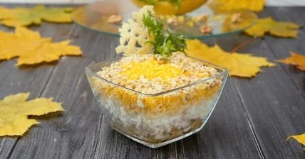 - Укладіть салат шарами: цибуля, куряче м’ясо, терті білки, кружальця бананів, тертий сир, терті жовтки. Кожен шар змастіть майонезом. Зверху посипте тертими волоськими горіхами.