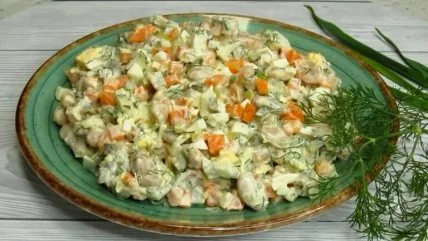 - Перемішайте всі інгредієнти, додайте зелень та часник. Посоліть, поперчіть, заправте майонезом та насолоджуйтесь!