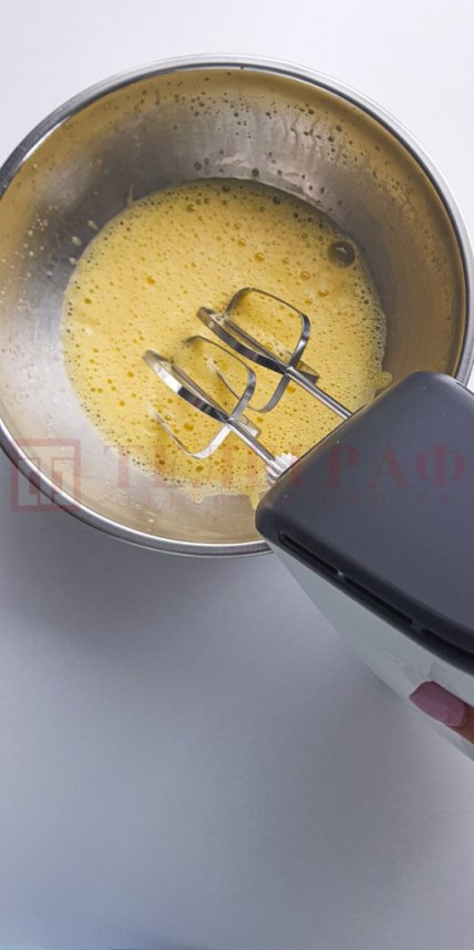 За допомогою міксера яйця збити до пишної піни, потім всипати цукор і сіль. Збивати до загустіння.