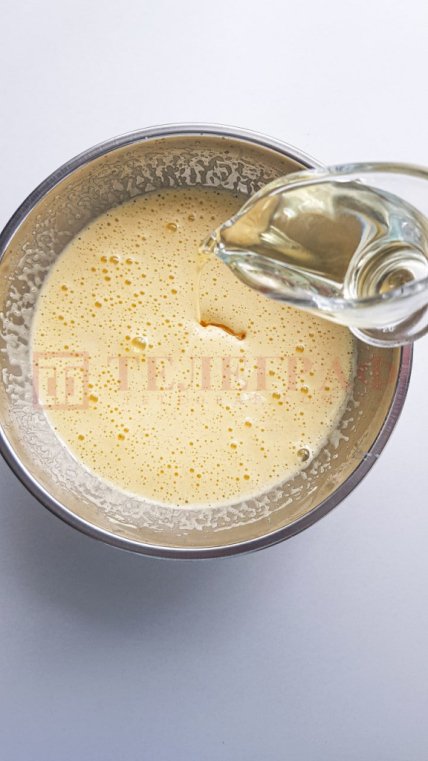 У яєчну суміш додати кефір і оливкову олію, добре перемішати до однорідної консистенції.
