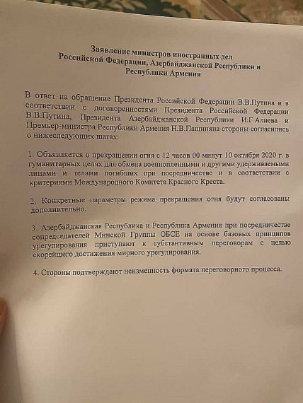 "Оголошується про припинення вогню з 12 години 00 хвилин 10 жовтня 2020 року в гуманітарних цілях для обміну військовополоненими та іншими утримуваними особами і тілами загиблих при посередництві і відповідно до критеріїв Міжнародного Комітету Червоного Хреста", - йдеться в документі.