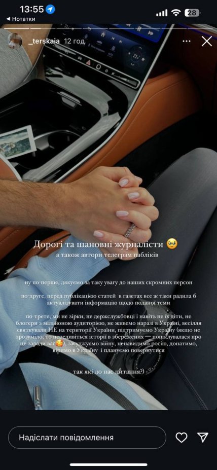 У відповідь жінка наголосила, що ні вона, ні її чоловік не є держслужбовцями, зірками чи великими блогерами. Крім того, вона додала, що вони не живуть в Україні, хоч і планують туди повернутися в майбутньому, і не святкували весілля на її території.