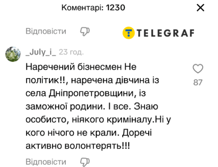 У коментарях під одним з відео про весілля з'являються деталі від людей, які стверджують, що знають пару особисто. За їхніми словами, Владислав — успішний бізнесмен. А от Ангеліна, як виявилося, родом не з Києва, а з невеликого селища на Дніпропетровщині, щоправда, із заможної родини.