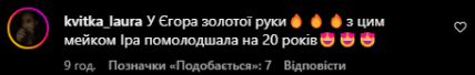 "Крутий образ", "У Єгора золоті руки. З цим мейком Іра помолодшала на 20 років", "Яка краса", "Помітно помолодшали!", — написали користувачі соцмережі.